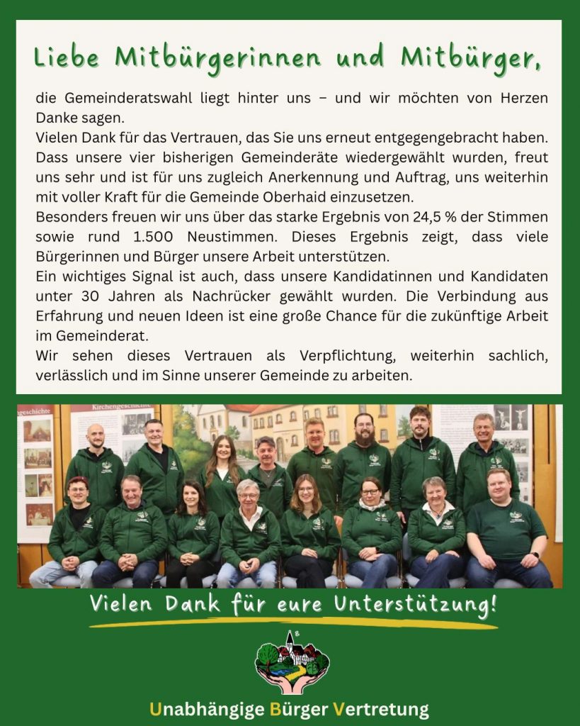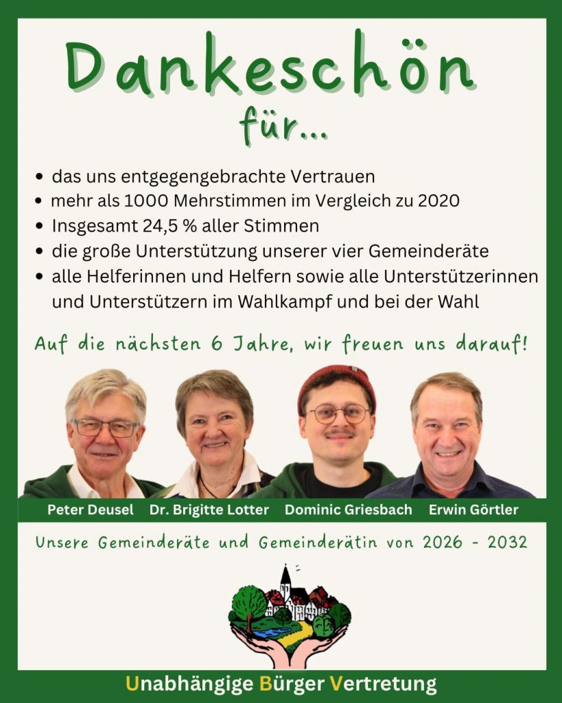 Wie unterer Grafik zu sehen, hat sich die positive Resonanz der Bürgerinnen und Bürger auf unsere fundierte und unabhängige Sachpolitik auch in der letzten Kommunalwahl im Jahr 2020 widergespiegelt, in welcher wir mit erstmals vier Sitzen in den Gemeinderat gewählt wurde. Wir hoffen, diesen positiven Trend auch bei der diesjährigen Wahl fortzusetzen, um mit zusätzlichen Mitgliedern die Interessen und Belange unserer Bürgerinnen und Bürger im Gemeinderat weiterhin unabhängig, sachlich und offen vertreten zu können.